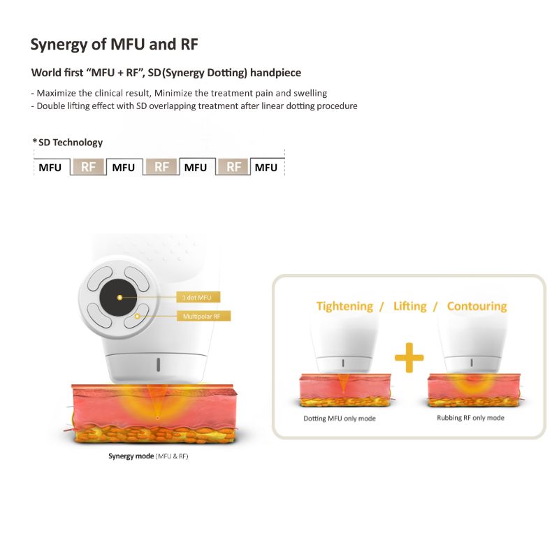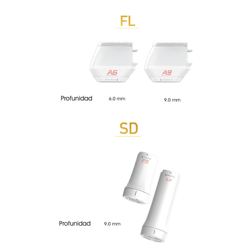 Tecnología sinérgica MFU + RF: trabaja en capas de 1,5 mm hasta 13 mm de profundidad, alcanzando dermis profunda, fascia y tejido subcutáneo.
