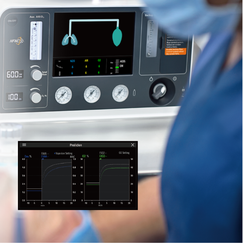 - Con la función de predicción, es posible ver la tendencia futura del agente anestésico y la concentración de O2, lo que hace que el personal clínico tenga más confianza para ajustar los agentes anestésicos y el gas fresco.